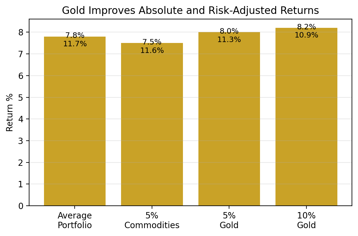 • Gold offers reduced volatility as compared to other commodities, allowing gold allocations to potentially improve portfolio stability and risk-adjusted returns.