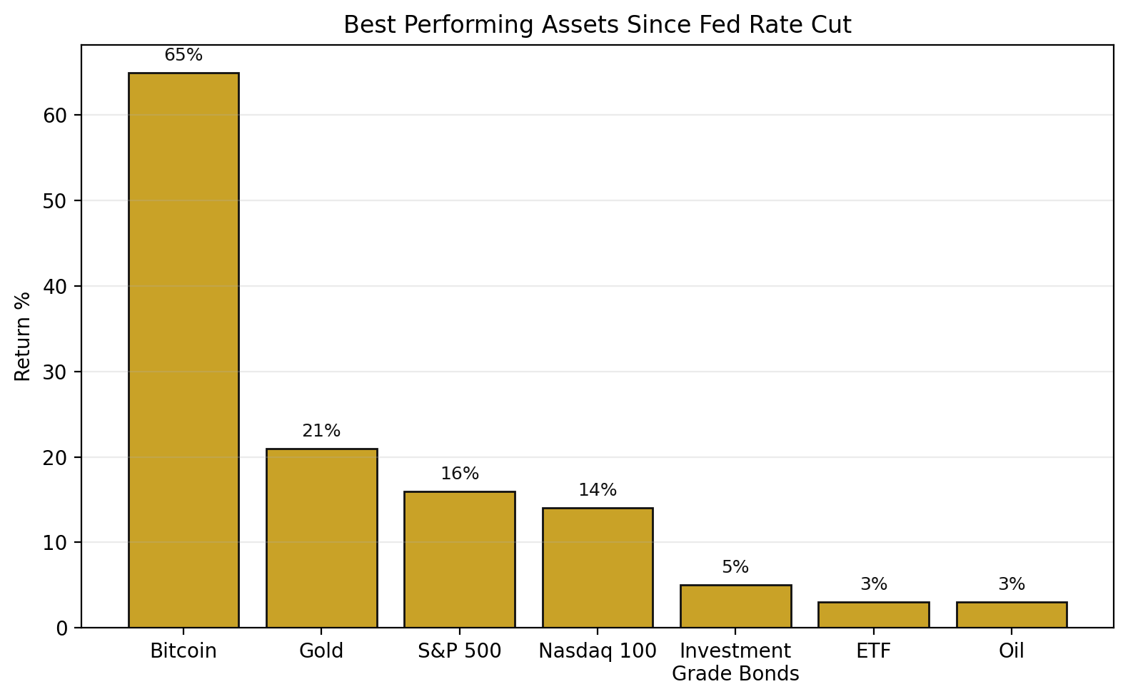 Gold has historically done well during periods of interest rate decreases. In Oct-24, the bank of Canada has further enacted an interest rate cut of 50bps. Since the latest Federal Reserve rate cut, gold has been the secondbest performing asset, behind bitcoin.
