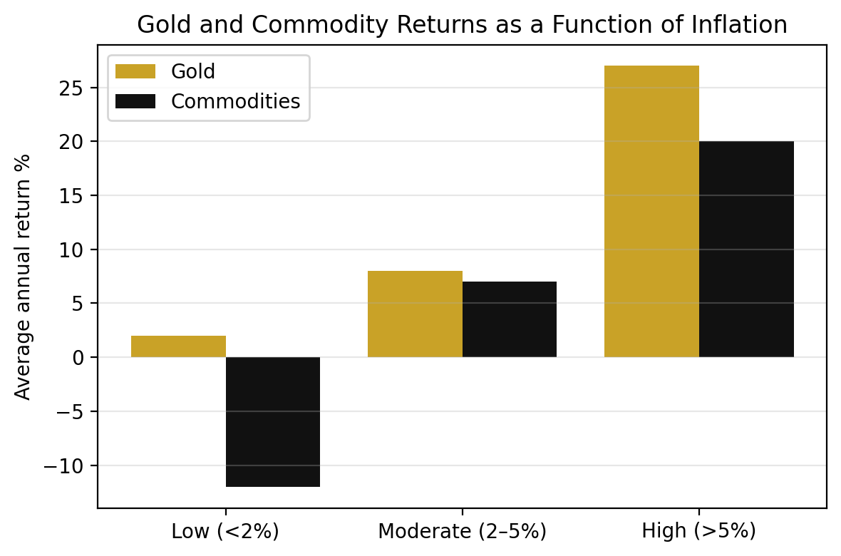 • In a protracted high inflation environment, gold allocations have the potential to outperform other commodity allocations, while simultaneously offering additional downside protection in a low inflation environment.