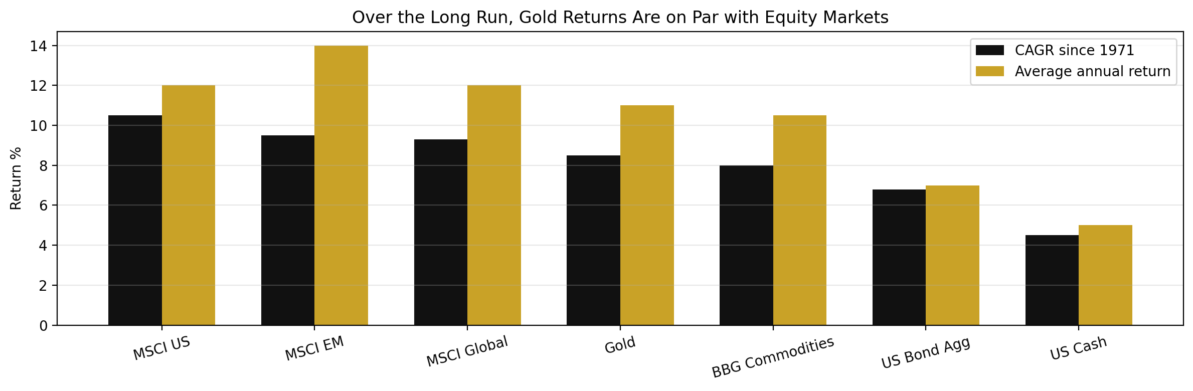 Despite the recent outperformance of equities, gold has generated strong annualized returns over the long run when compared to domestic and international equity markets.