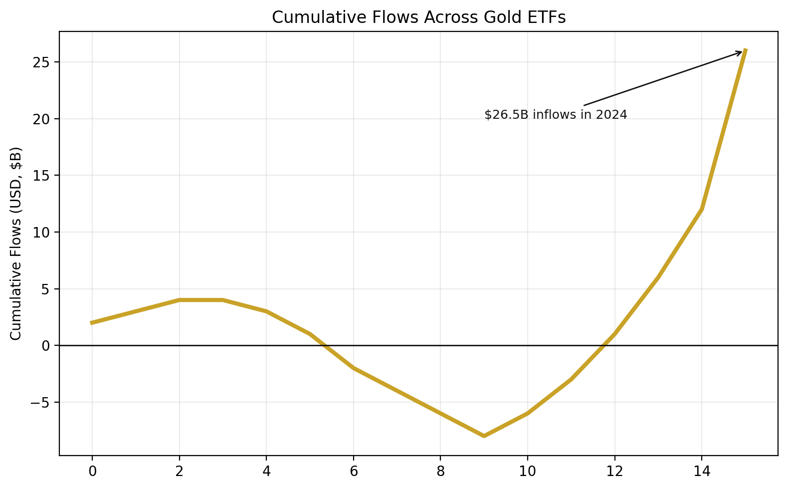 • Furthermore, the holdings of ETFs backed by physical gold only rise gradually following an interest rate cut. Specifically, gold ETF holdings increase gradually for approximately six months following a policy rate reduction.